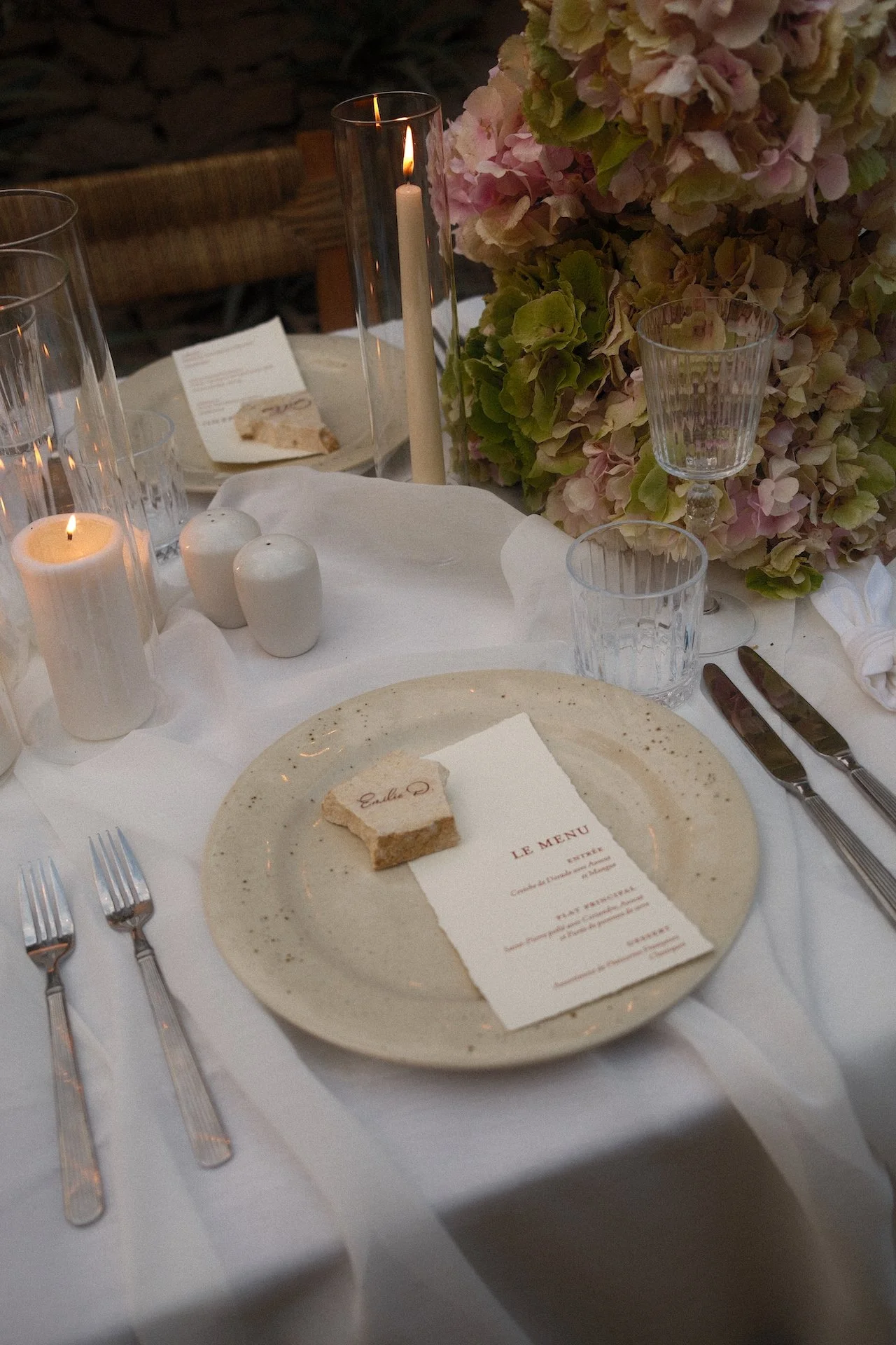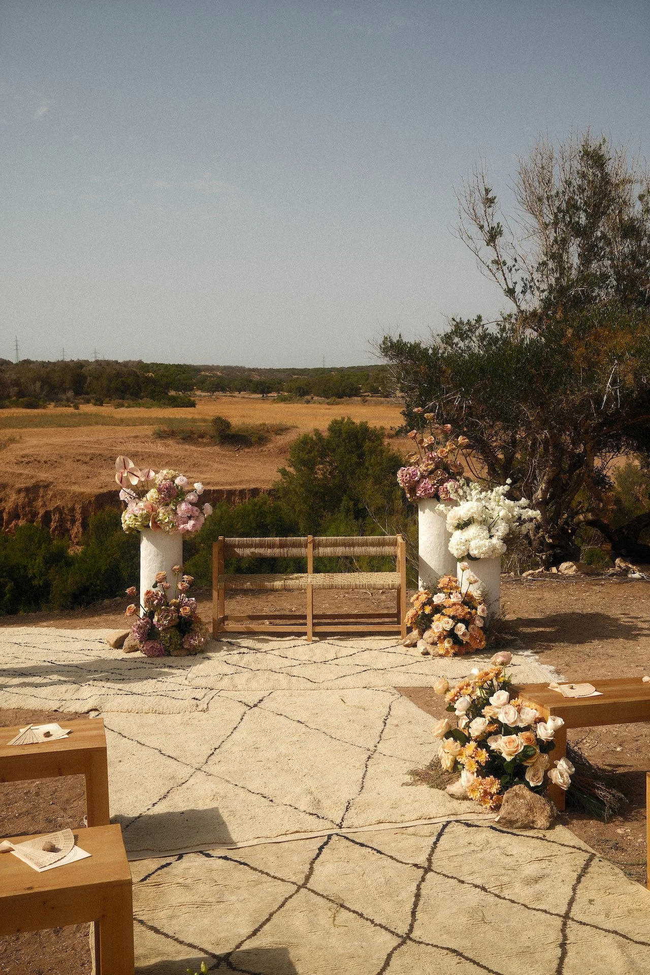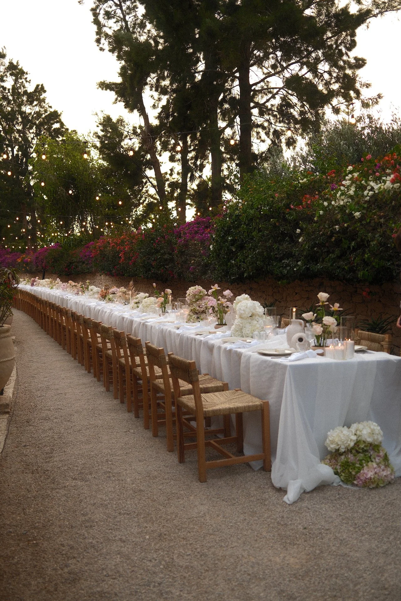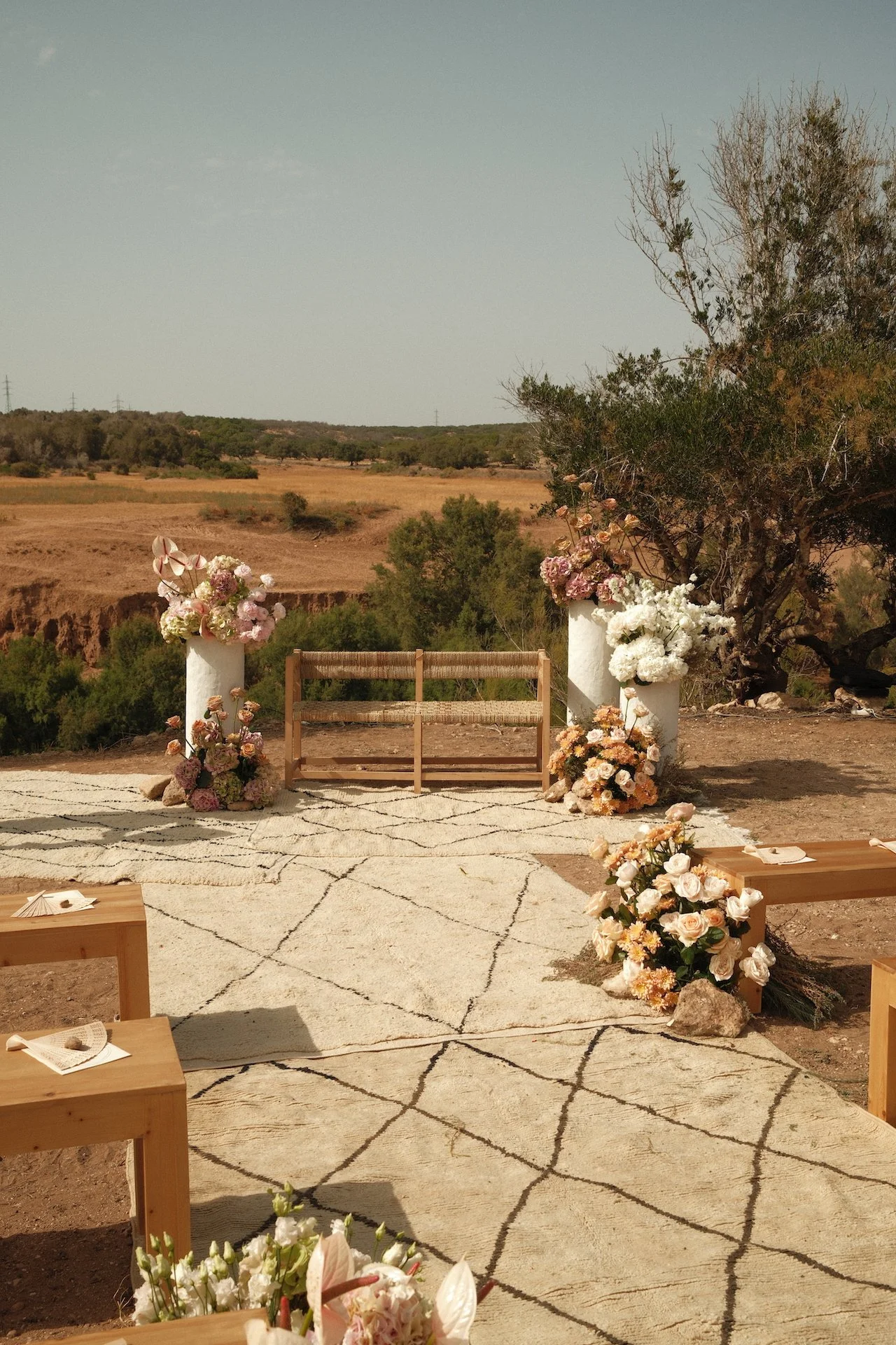Alexia and Geraud chose the coastal town of Essaouira as the backdrop to their wedding vows. The special landscape close to their wedding venue Le Jardin des Douars provided the most beautiful views during the ceremony. A river valley in the back, scattered argan trees and goat herds made the ceremony nothing short of unique, with lush blooms in white, blush and soft greens. A cocktail reception was celebrated at the pool, after which dinner was served in the long alley way amongst the bougainvillea and beautiful gardens of the venue. The tables were beautifully styled by The Souk Department with romantic draped linens, and we arranged rustic pots with tumbling flowers and Ikebana style arrangements filled with peonies, hydrangea, tulips and orchids.
