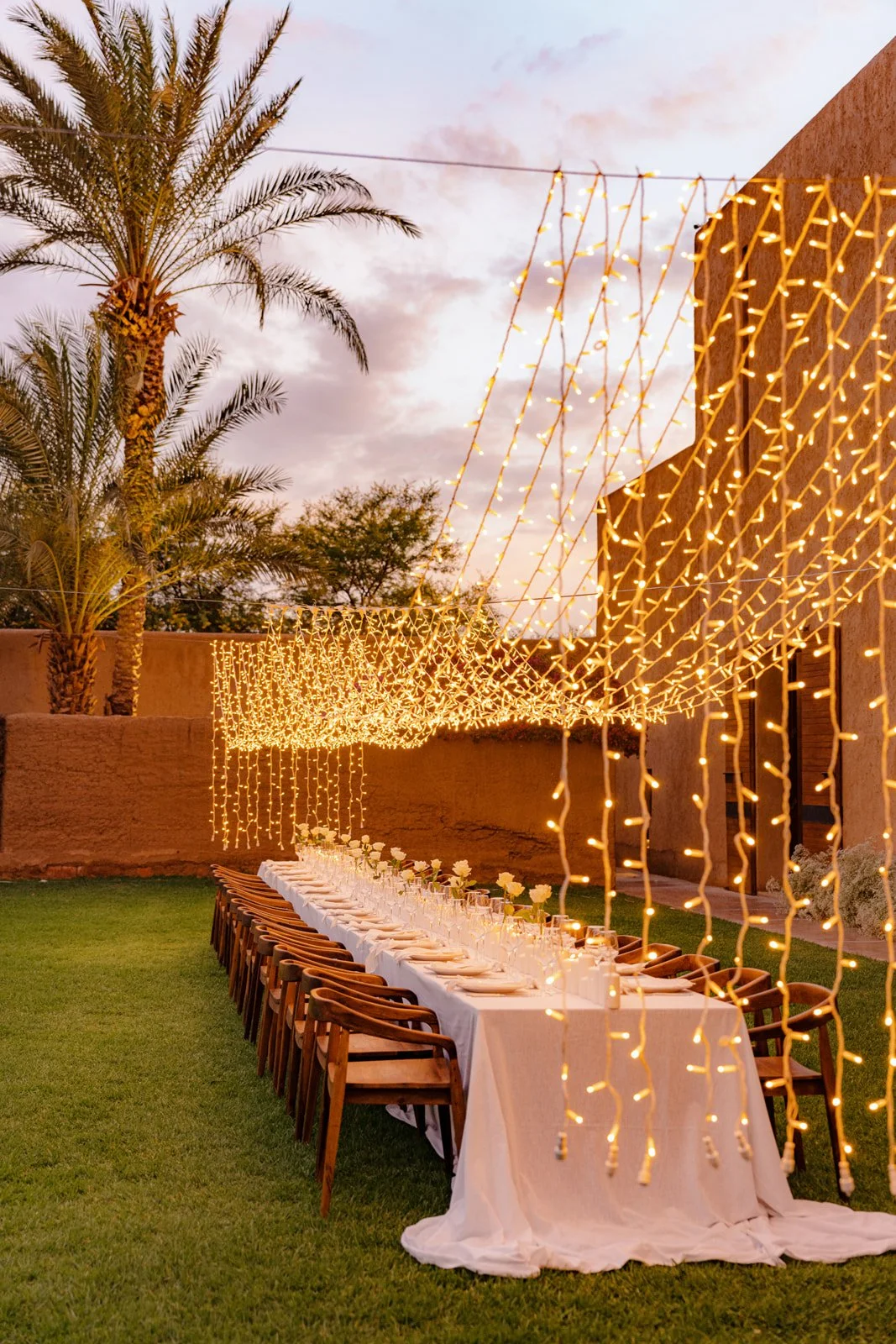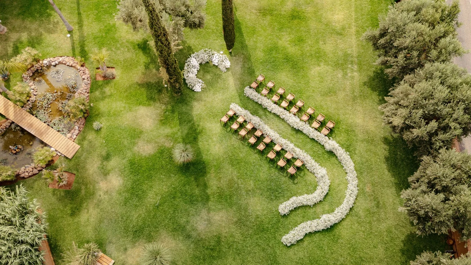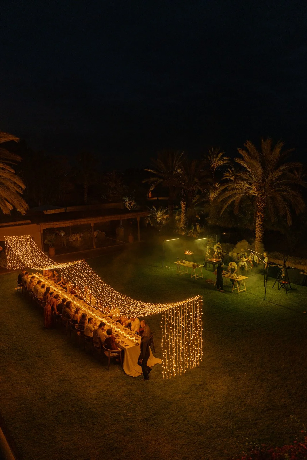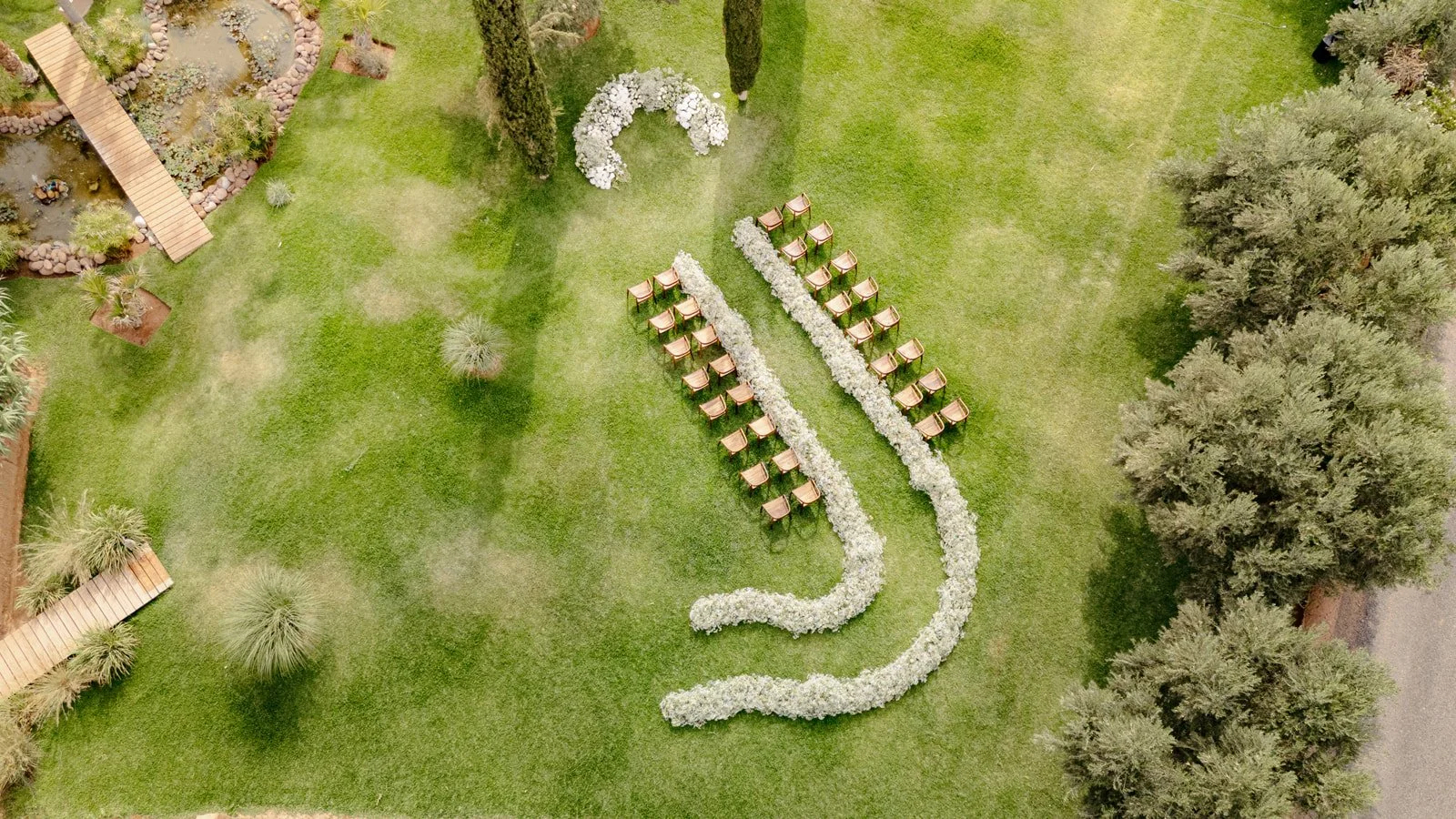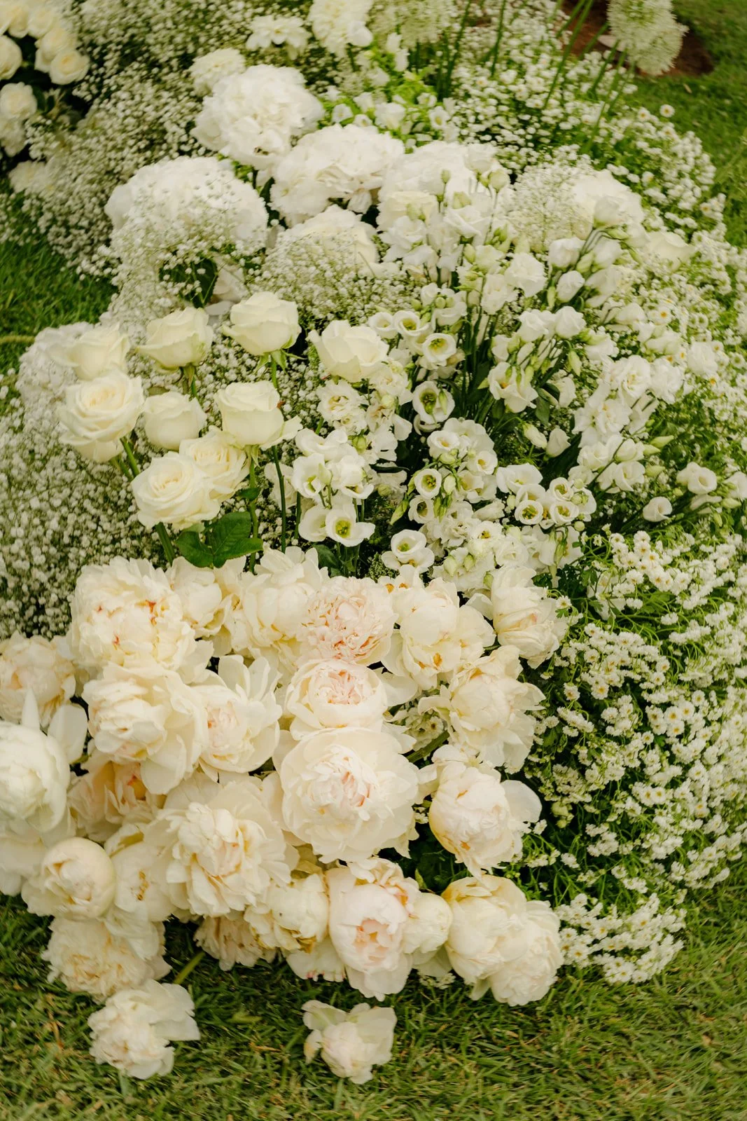 Clouds and clouds of white baby’s breath created a whimsical meandering aisle in the stunning gardens of Villa D, where Lauren and Dylan married each other in front of their nearest and dearest. The textural architecture of Villa D, characterized by minimal lines, yet rustic character, was the perfect backdrop to their elegant white floral backdrop. An aisle filled with baby’s breath, and circular floor arch with masses of white flowers such as peonies, hydrangea, roses and chamomile created a fairytale ceremony. Dinner was served under a twinklelight curtain, with a table filled with candles and simple white roses in bud vases. The perfect celebration of love!
