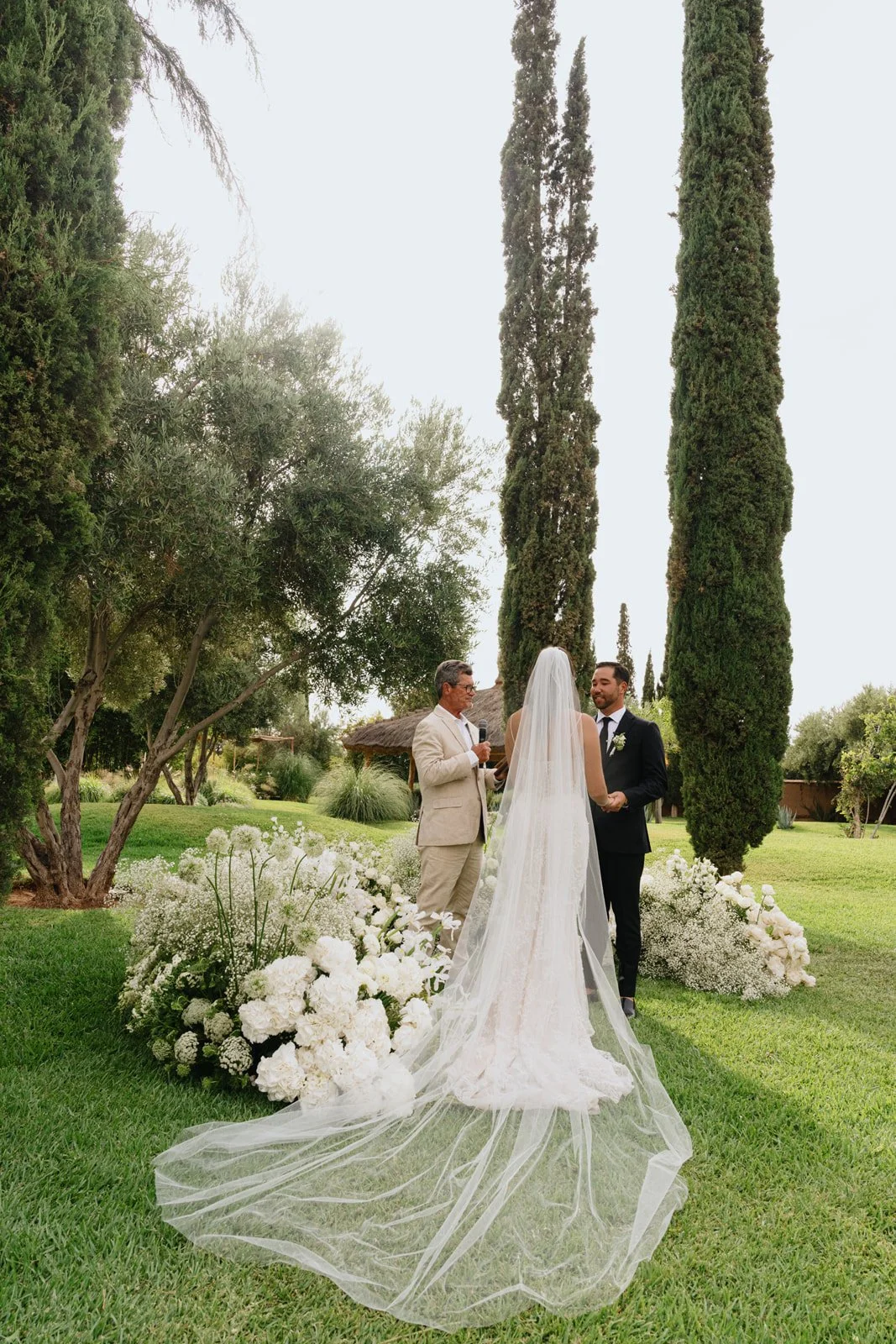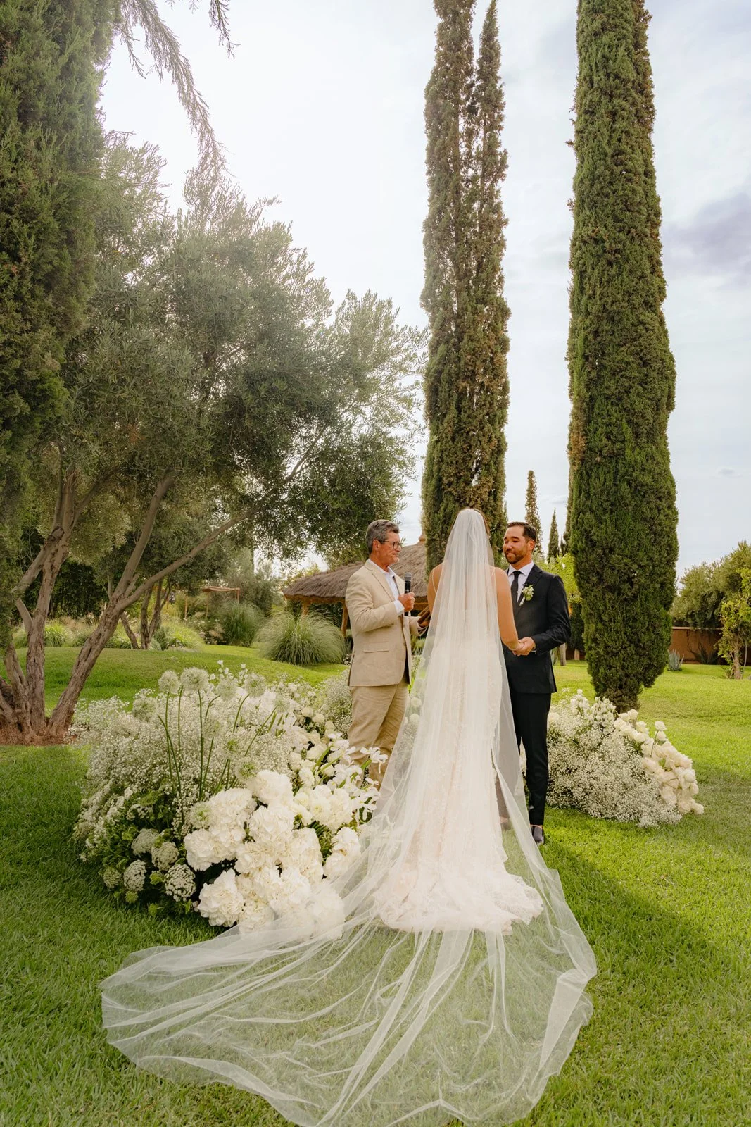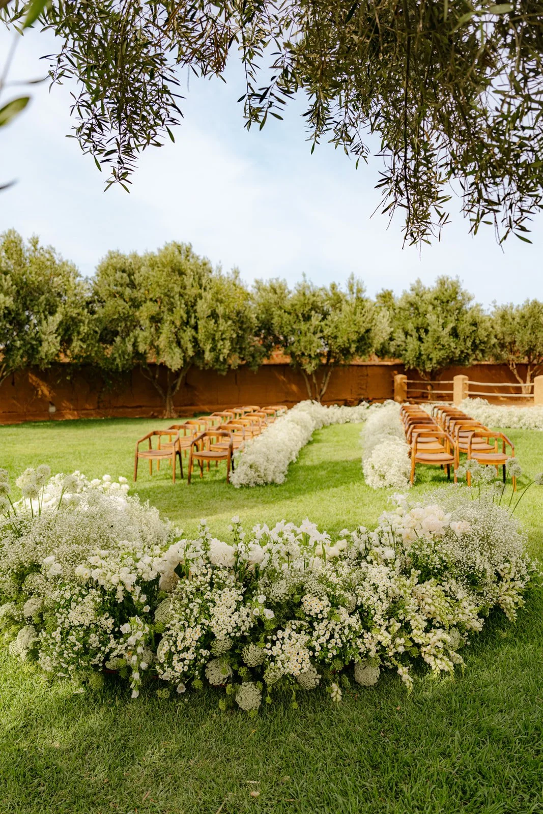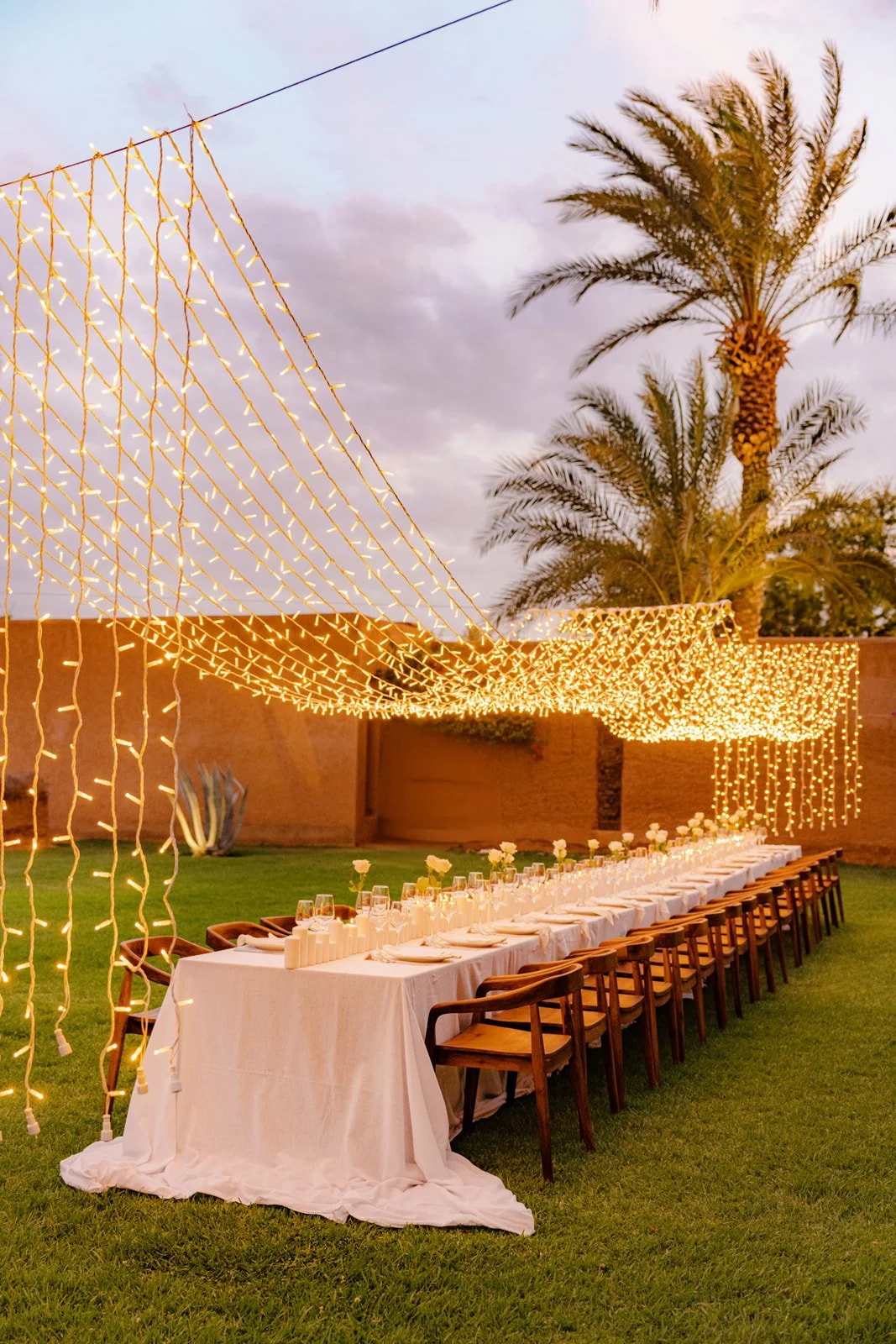 Clouds and clouds of white baby’s breath created a whimsical meandering aisle in the stunning gardens of Villa D, where Lauren and Dylan married each other in front of their nearest and dearest. The textural architecture of Villa D, characterized by minimal lines, yet rustic character, was the perfect backdrop to their elegant white floral backdrop. An aisle filled with baby’s breath, and circular floor arch with masses of white flowers such as peonies, hydrangea, roses and chamomile created a fairytale ceremony. Dinner was served under a twinklelight curtain, with a table filled with candles and simple white roses in bud vases. The perfect celebration of love!