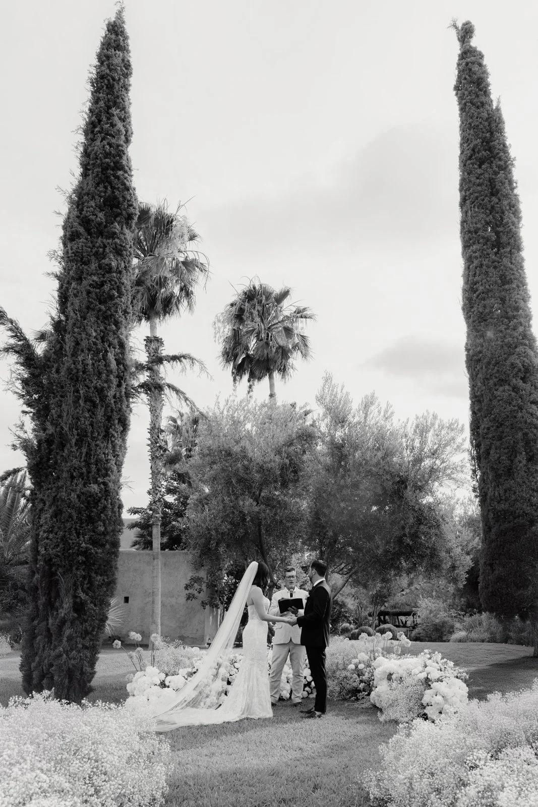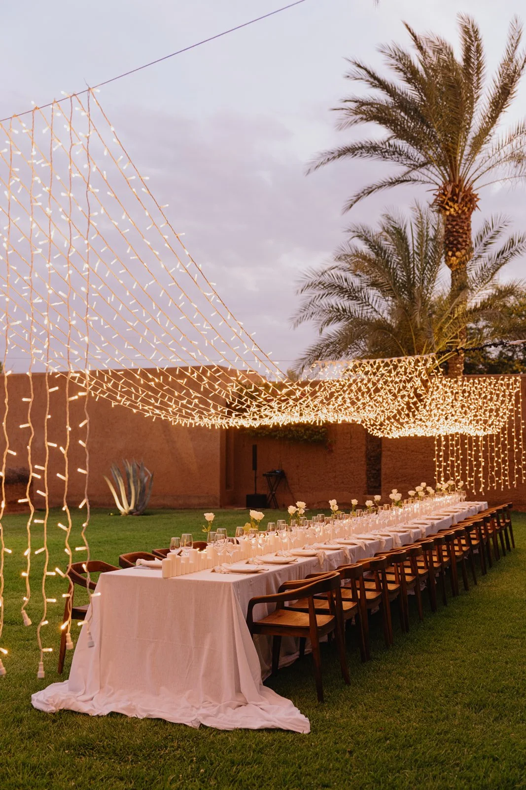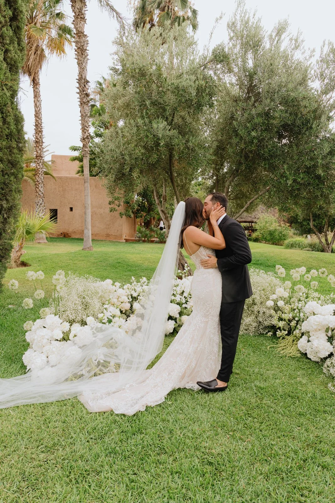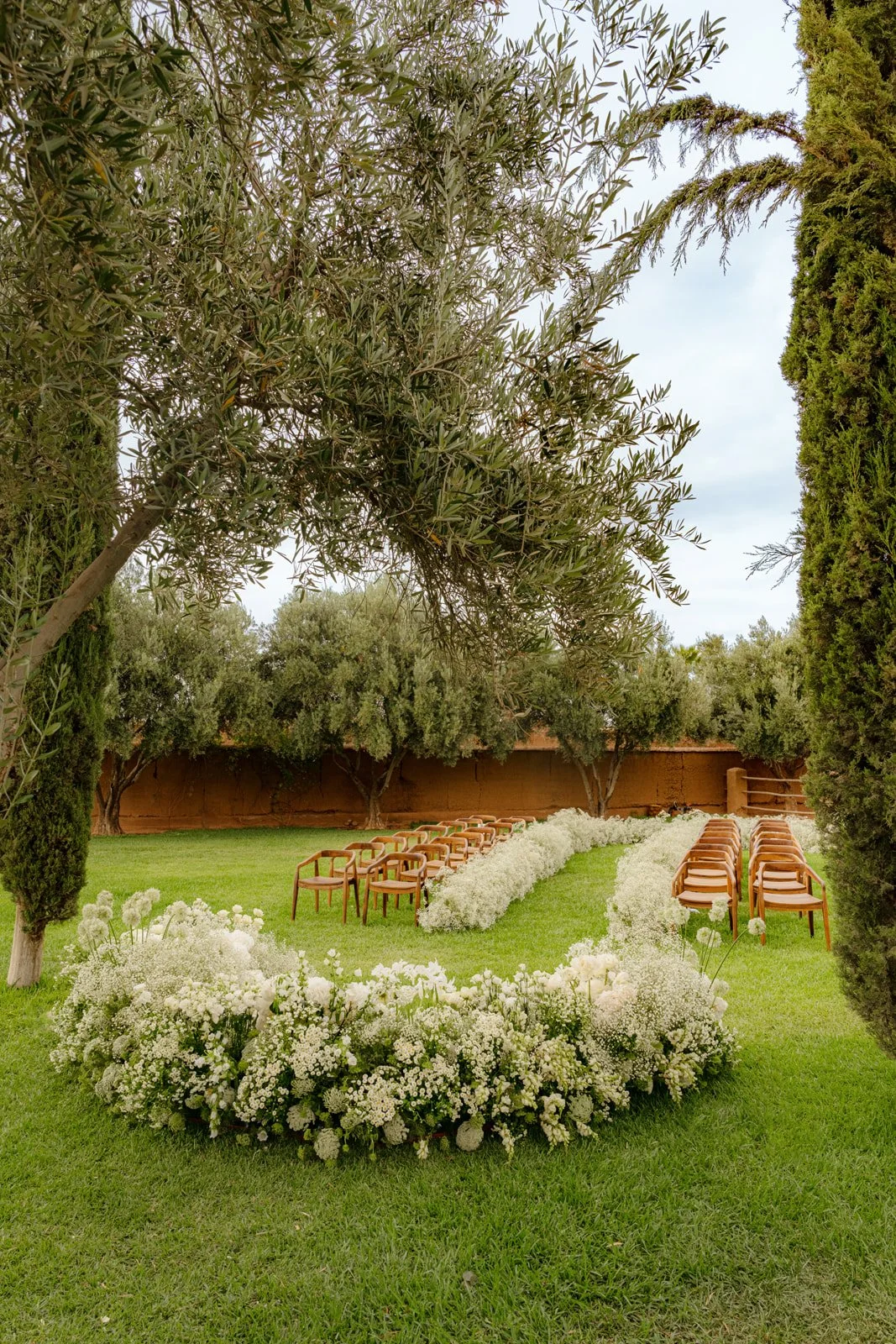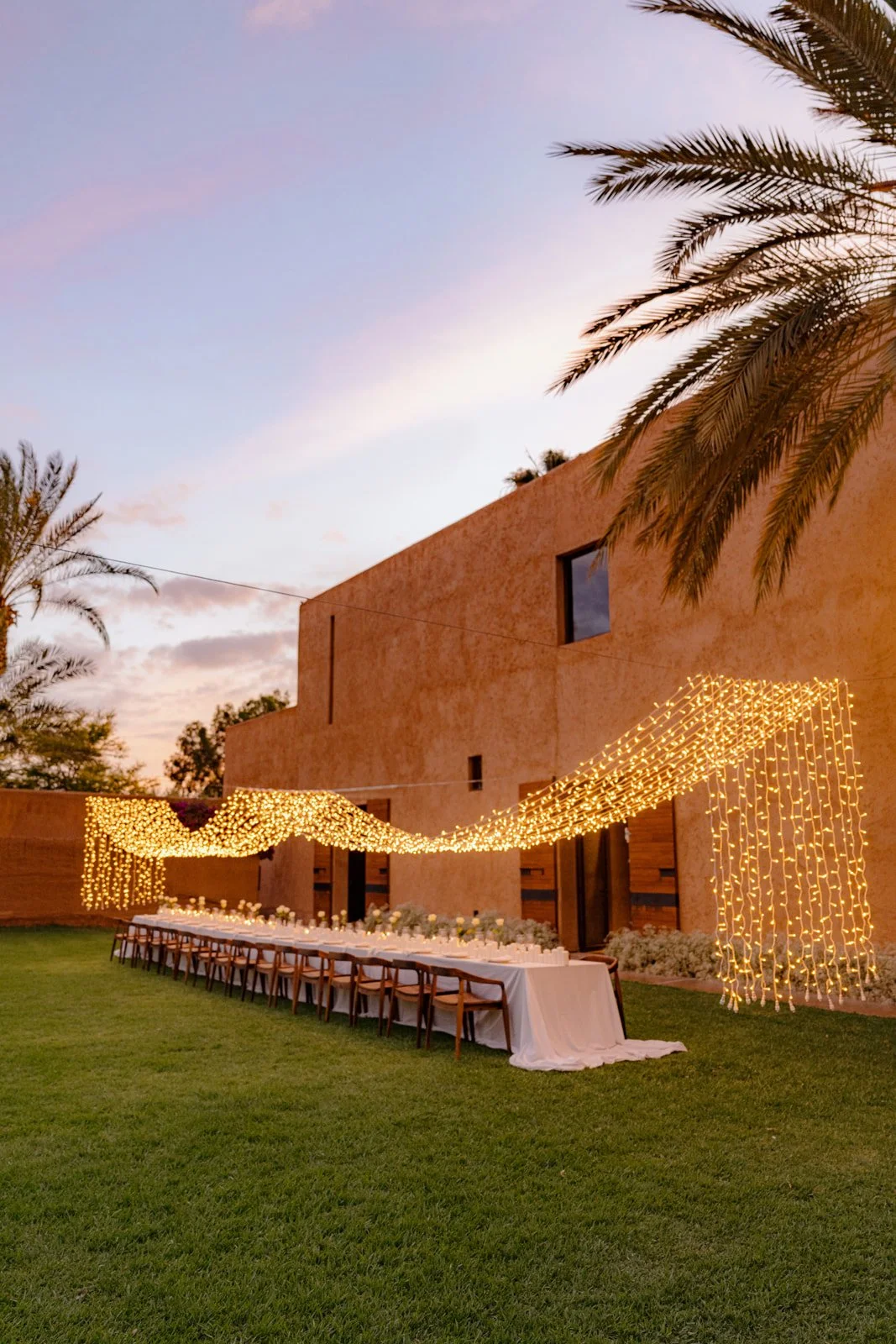 Clouds and clouds of white baby’s breath created a whimsical meandering aisle in the stunning gardens of Villa D, where Lauren and Dylan married each other in front of their nearest and dearest. The textural architecture of Villa D, characterized by minimal lines, yet rustic character, was the perfect backdrop to their elegant white floral backdrop. An aisle filled with baby’s breath, and circular floor arch with masses of white flowers such as peonies, hydrangea, roses and chamomile created a fairytale ceremony. Dinner was served under a twinklelight curtain, with a table filled with candles and simple white roses in bud vases. The perfect celebration of love!